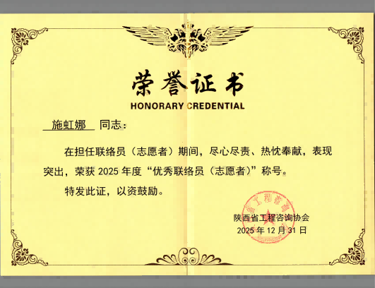 喜报!我司施虹娜同志荣获陕西省工程咨询协会 2025 年度 “优秀联络员(志愿者)” 称号